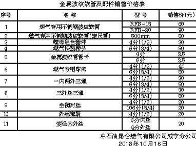 | 咸宁昆仑燃气有限公司金属软管价格公示 |