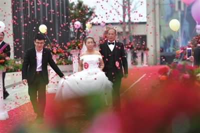 12对咸宁幸福老人齐聚一堂,他们穿上笔挺的西装和洁白的婚纱,走红毯,拍婚纱照,重温爱的誓言,举行了一场别开生面的集体婚礼。