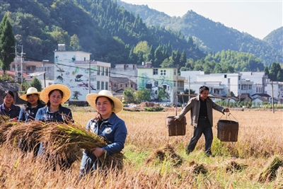 近日,通山县南林桥镇石门村彩色水稻种植基地上,农户正在开镰收割,一同享受丰收的喜悦。