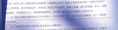 10月31日上午,刘某某向《党报问政》栏目记者出示了其取得的该项目标书。记者看到,标书内第五章两处关于报价的约定要求不一致,其中第一处约定要求为“总价精确至元,否则视为无效投标”。