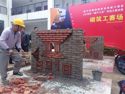 砌筑工职工组第一名的梅玉龙,17岁开始砌砖,至今已有30年砌筑砖工龄。比赛现场,他沉着稳重,每一块砖,每一滴泥,在他的手中都能巧妙融合。他手拿小铲筑砖、敷泥、压实、“修剪”后还再次除尘一次,历经5个小时,一堵别有创意的墙体完工。