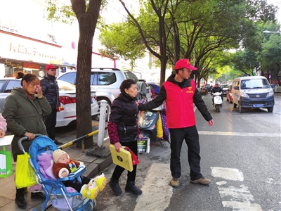 张晏山是咸安区委巡查组的一名工作人员。当天,他作为志愿者来到嫦娥广场附近,和双龙社区的两名志愿者一起劝导行人按照规矩过马路。