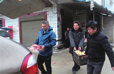 12月11日,市税务局驻通山县南林桥镇青垱村第一书记吴坚(中)和村干部将从贫困户家收集的猪肉、萝卜等农产品装车,准备拉往市场销售。