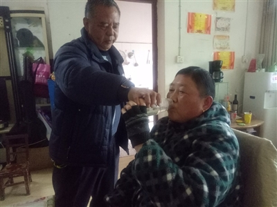 “来擦擦手,再把热水给喝了……”12月22日上午,在咸安区同心路社区6号楼402室,阮辽炎端着一杯水慢慢地递给张美华喝。