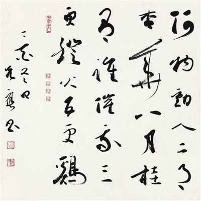 华先应自创现代书法书写的“无无明亦无无明尽”,为表达其中意境,曾用浓淡枯湿、强化提按等方式都没有达到自己想要的效果,最后他用隔宿之墨书写,含水旁渖,浓淡相宜,自有一种烟雨氤氲之气,沉静之致,是他独到心得的体现。