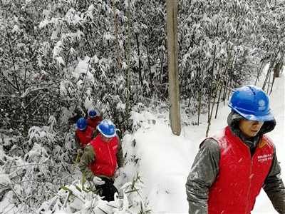 身着鲜红的马甲,穿戴整齐,手拿伐刀踏雪寻竹障是他们的目标。“不能等着大雪把竹子压倒,要沿着线路走,发现有距离线路稍近的存在倒竹隐患的竹子都要砍掉。”阚光志是供电所的老师傅,十年伐竹让他积累了丰富的清竹障经验。