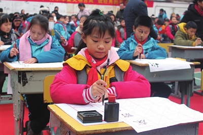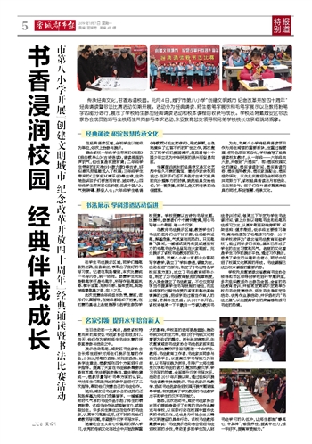 据悉,市第八小学一直都十分重视写字教学,确立了“学科渗透,课堂为主,活动促进”的原则,制定了《书法特色学校实施方案》,成立了书法教育领导小组,制定了为书法教育服务的规章制度,投入资金建立了书法教室。不仅仅把写字当作提高学生书写技能的途径,而且将练字的过程当作美的鉴赏和陶冶高尚情操的过程,把练字的过程当作育人的过程,使其终生受益。从2017年开始,该校将每周一下午最后一节课为教师书法培训时间,每周三下午定为学生书法课时间,课上分别以硬笔书法和毛笔书法练习为主,从基本笔画到偏旁部首、间架结构,循序渐进,低年级主要练习楷书,高年级增加了毛笔练习内容。2017年学校被评为“湖北省书法教育实验学校”,经过两年多的实践,基本已形成了学生的自主习惯和风气。各班的文化墙是学生习作的展示平台,通过习作展示,培养了学生的兴趣和自信心,同时也促进了校园文化氛围的形成。书法课程已成为校本课程的重要内容。