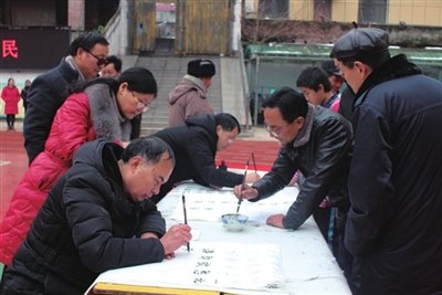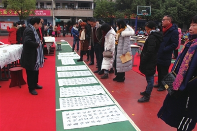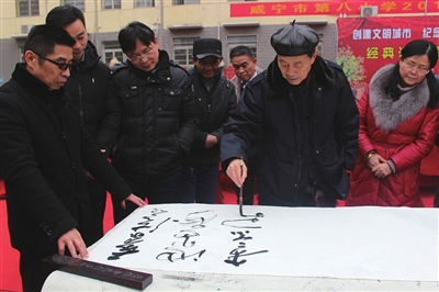 当日活动的一大亮点,是受该校特邀而来的咸安区书法家协会的成员们。当天,他们作为学校师生书法比赛的评委直接参与活动之中。