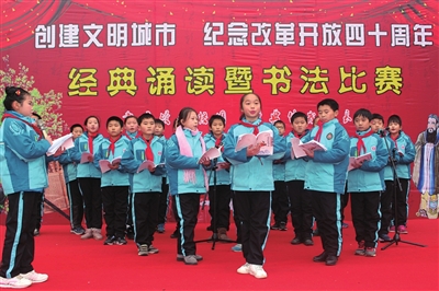 传承经典文化,书香沁满校园。元月4日,咸宁市第八小学“创建文明城市 纪念改革开放四十周年”经典诵读暨书法比赛活动如期开展。活动分为经典诵读、师生钢笔字展示和毛笔字展示以及教师粉笔字四部分进行,展示了学校师生参加经典诵读活动和校本课程的收获与成长。学校还特邀咸安区书法家协会成员到场与全校师生共同参与本次活动,永安教育总支领导和兄弟学校校长也亲临现场观摩。