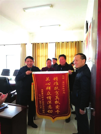 本报讯 (记者 熊大平 通讯员 余茹) 近日,一面写着“精准扶贫真抓实干 关心群众情深意切”的锦旗送到了市教育局。这是来自通城县大坪乡大坪村75岁的老党员胡友全发自肺腑的感谢之情。
