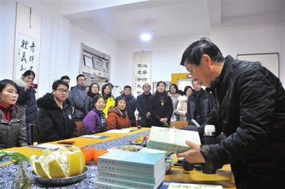 1月15日下午,咸安区温泉街道办事处南昌路社区国学经典教育推广中心内,书声朗朗,10余名各个年龄段的社区居民们聚集一起,学习诵读《父母规》、《夫妻规》等国学典籍。