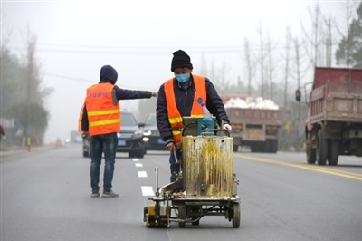 近日,记者在107国道中伙铺镇至官塘镇路段看到,道路已拓宽至6车道,施工人员正抢抓晴好天气,加紧施划道路交通标线。 记者张仰强/摄