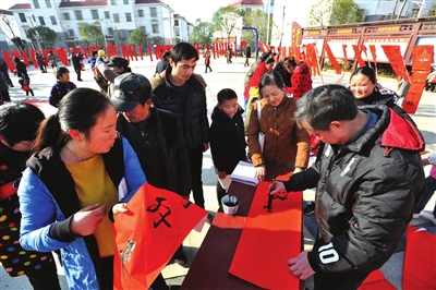 1月24日,咸宁高新区横沟桥镇付桥村文化广场,一名书画家正在给当地村民写春联。据了解,当天,市、区老年大学和诗书画协会一行20余人来到付桥村,开展年前送春联进万家活动。书法家们尽情地挥毫泼墨,把一副副满载新春祝福的春联送到当地群众的手上,为即将到来的猪年新春增添了浓厚的节日气息。 全媒体记者 夏正锋 通讯员 饶婧兰/摄