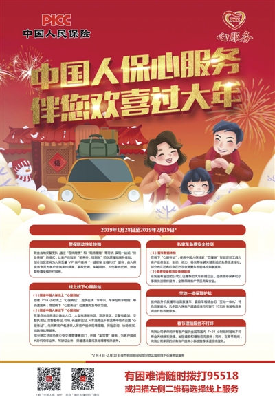 此次活动时间为2019年1月28日至2019年2月19日,服务对象为全体人保客户、社会各界朋友。重点推出“警保联动快处快赔、线上线下心服务站、私家车安全检测、空地一体保驾护航、春节理赔服务不打烊”五项服务。