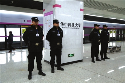 2月19日,武汉地铁2号线南延线试运营首日,受到武汉市民频频回眸“点赞”的,除了精心设计的各个靓丽站点,还有来自我市兴安保安集团的136名安保、安检人员。只见他们身着统一的深蓝色制服,或手持安防警棍巡守在车站区各处,或在进出口区域耐心细致地服务于来往群众。