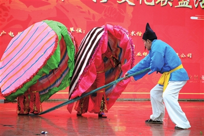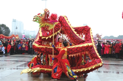 铿锵的鼓点响起,四条彩龙“游”过人群,“游”上主舞台,长长的龙身在舞龙队员的舞动下翻滚游动,摆出种种造型,现场观众纷纷喝彩叫好。