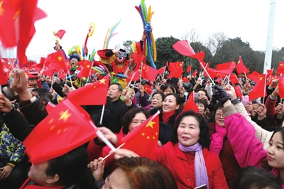 当《我和我的祖国》的歌声响起,人民广场顿时成了红色的海洋,欢乐的海洋,万余名市民一边挥动小国旗,一边纵情歌唱;那无数面舞动的小国旗就像红色的波澜,一波接着一波的涌动。