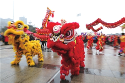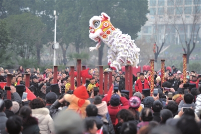 白狮和红狮子配合鼓点,时而腾挪跌宕、来回翻滚,把狮子的动作、神态都演绎得惟妙惟肖;时而在梅花桩架上左右穿梭,俯仰跳跃,惊险的表演掀起一阵阵惊呼声,市民拿着手中的相机、手机,争相定格每一个精彩瞬间。