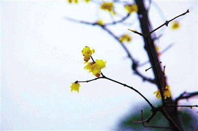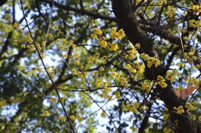 最早开出的就是黄色的腊梅在一月底就已开放。犹如凝脂,一小朵一小朵挂在树枝上,自顾散发幽香引人前往。