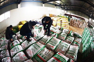 2月21日,咸宁高新区横沟桥镇丰顺农资公司员工在调运化肥。春节过后,全市农业部门早安排,早部署,积极做好春耕备耕农资储备供应工作。截至目前,已购备早稻、中稻、玉米、棉花、蔬菜等良种300万公斤,化肥18万吨,确保当前春耕所需。