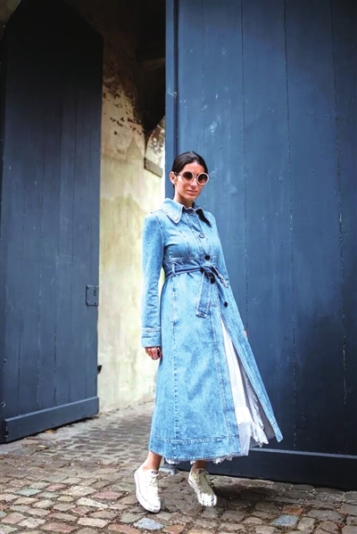 长裙优雅柔美,而牛仔风衣带着中性风,这两件单品搭在一起却也能碰撞出独特的火花。