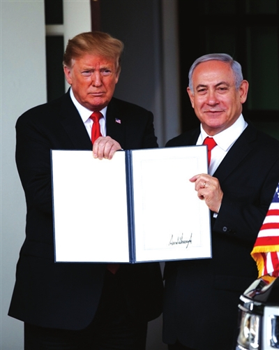 美国总统特朗普25日在白宫与到访的以色列总理内塔尼亚胡举行会谈,并签署公告正式承认以色列对戈兰高地的主权。