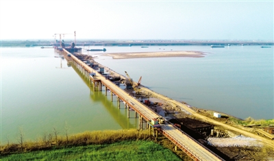 ▲3月21日,赤壁长江公路大桥南岸,工人们抢抓时机施工。目前该桥南北主塔均进入下横梁施工阶段,滩桥和跨堤桥下个月开始转入上部结构施工。