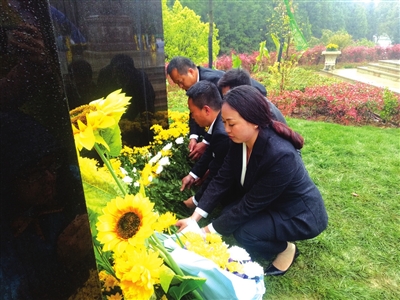 咸安区帅印山公墓67岁的绿化工人梁云明放下手中的工作,拿起一束黄菊花来到纪念碑前,默默地鞠躬献上鲜花。