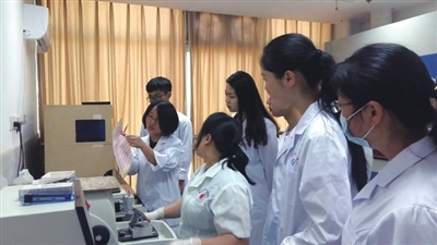 在她的带领下,记者参观了病理科取材室。刚进门,一股浓烈的味道扑鼻而来。取材室内,病理医生和技术员正带着口罩在取材平台上忙碌着。旁边摆放着一排排标本袋,里面装着患者活检或手术切除的病变组织。科主任黄海燕告诉记者,病理科每年接诊1万多例标本。而一张优质的病理切片,看似简单,但实际上需要经过固定、取材、脱水、透明、浸蜡、包埋、切片、染色等10多道步骤近40道工序,这其中,除了脱水等少数工序是靠自动化的机器完成外,其余都是手工操作,直至最后读片出报告,每个步骤都环环相扣。