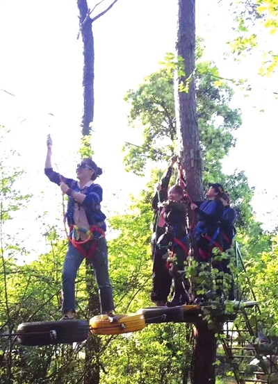 4月6日记者在嘉鱼玉龙岛庄园看到,不少来自周边省市的游客带着孩子们来到这里,带他们进行体能锻炼和拓展训练。