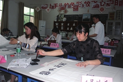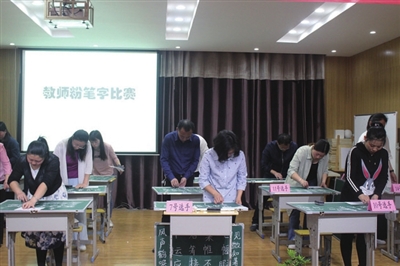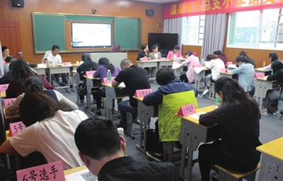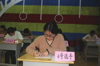 记者在现场看到,各赛场上,参赛老师自信、执着,追求卓越、张扬个性。他们纷纷使出浑身解数:朗读比赛,字正腔圆,声情并茂,准确地将文章表达的情感传达给听众,表现了一个优秀语文教师所必须具备的语言素养。粉笔字比赛,书写规范整齐,排版美观;毛、钢笔字比赛,各具特色,楷书端正整洁,隶书秀美圆润,形神兼备。字体或清秀、或飘逸、或刚正、或洒脱,或苍劲有力、或潇洒自如,蕴含了教师们对祖国语言文字的热情及娴熟的书法技艺;下水作文和教学设计赛场,老师们或凝神构思,或奋笔疾书……个个使出浑身解数,一展身手。本次比赛得到区教育局和温泉教育总支领导高度重视,他们亲自来到赛场巡查,为老师们送来春风般的温暖。