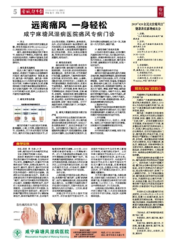 另我科还尤其注重痛风的临床研究,2019年4月20-5月20日期间,招募100名痛风患者,给与检查费用的减免优惠。同时每年通过电视媒体、网络微信等定期为患者开展高尿酸血症、痛风的健康教育,给予患者生活及康复指导。