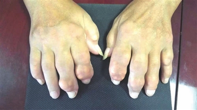 现病史:患者诉约十年前无明显诱因出现右踝关节外侧肿痛,在当地诊所予以针灸、拔罐等治疗,右踝关节外侧渐形成皮下肿块,后渐出现肩关节、足趾关节、踝关节、膝关节、腕关节及手指关节等游走性间断性反复肿痛症状,每次发作持续约一周即可自行缓解。起病初未行系统检查及治疗。起病3年后患者在武汉市新洲医院检查诊断为“痛风”,每次关节肿痛发作时即服用秋水仙碱片、别嘌醇片等药物治疗,治疗约1年后患者因担心西药副作用而未再服用。之后间断在武汉市中医院、及当地诊所服用中草药治疗。期间关节肿痛严重时即在当地诊所予以静脉输液治疗,具体所输药物不详,自诉每次输液后肿痛即可缓解,2016年-2018年期间患者约每隔3-5天需输液1次。近2个月患者坚持未再输液,仅在关节痛甚难忍时服用“戴芬”治疗。现来麻塘风湿病医院就诊,诉四肢各大小关节游走性肿痛,四肢各处分布许多痛风石,以双手指末端及右足跗、双小腿分布痛风石为多,行走尚可,握拳不利。该院以“痛风性关节炎”收住院。