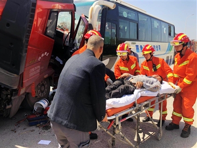 本报讯(记者陈志茹 通讯员朱燕林 官易洲 田鹏)嘉鱼县一辆半挂车与一辆大客车迎面相撞,导致1名驾驶员被困车内,9名消防员破拆驾驶室,成功救出被困人员。