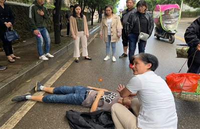 3名社区工作人员放下手上的工作,立即来到马路边。只见一名中年男子躺在路上,双眼紧闭,一名女子正在给他掐人中。