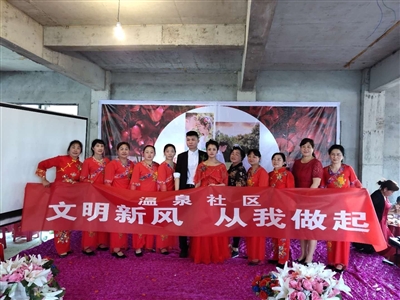 这对新人是温泉社区五组居民许铭和蒋金叶。该组组长刘安禄得知本组居民许清华的儿子许铭在今年5月4日要结婚,于是,他及时组织居民代表商议并向社区妇联申请,由5组文艺小分队通过文艺演出走进婚礼现场,引导广大干部群众倡导文明节俭、健康向上的生活方式,弘扬移风易俗、婚事新办的社会新风。