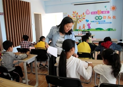 5月11日上午,咸安区温泉办事处十六潭社区幸福里·同心服务站内,10多名学龄儿童正在志愿者张晓红的辅导下练习硬笔书法。