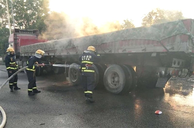 经查,这辆重型半挂牵引车因刹车片过热导致轮胎自燃,所幸未造成人员伤亡。