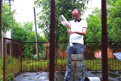 5月13日,天空下着蒙蒙细雨,记者来到距离城区30公里左右的咸安区四门楼水库,只见一中年男子身披雨衣,脚穿雨靴,行走在堤坝上巡察。这位中年男子就是年近40岁的水库管理员周天淦,他正认真的应对着即将来临的汛期。