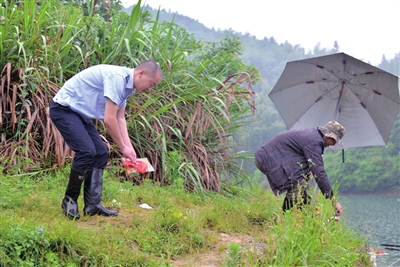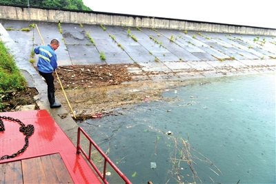 沿着水面巡察,看到有人钓鱼将垃圾袋随手丢弃,他毫不犹豫停船靠岸,将垃圾袋捡起装好交给钓鱼者,并提醒钓鱼者注意卫生,“这是水源地,一定要保证水库清洁卫生。”周天淦清理时,脚上沾满了泥泞。
