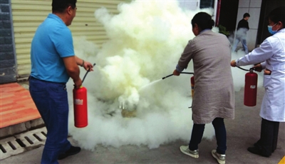 培训结束后,咸安区疾控中心组织职工在单位后院开展了消防灭火演练。安全员王俊介绍了干粉灭火器的正确使用方法及灭火时的注意事项,随后在场的干部职工使用灭火器对着起火点进行了灭火演练。