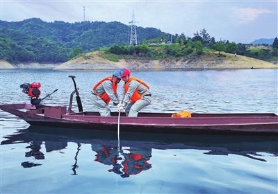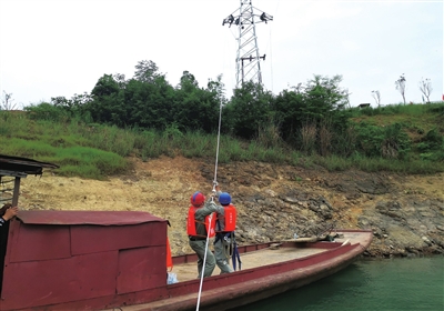青山水库是崇阳县12万居民的“水缸”,最宽处达1公里,最深处达80余米。平静的水面下地形复杂,这给放线施工带来了极大的困难。