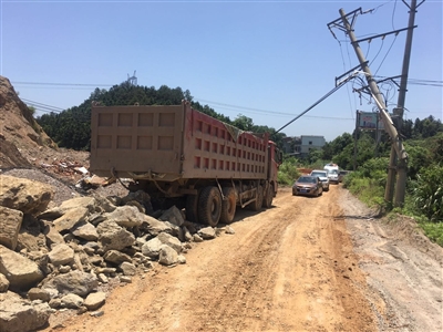 本报讯(记者 方达星 通讯员 钱旋)货车超载被查,司机为了逃避处罚,欲趁机在路边卸货未果后,竟然不顾民警阻拦强行卸掉一车风化石,导致路边电线和一根电线杆断裂。