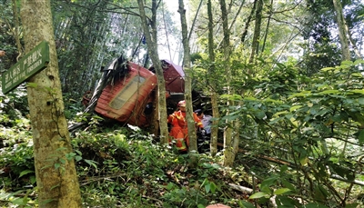 事故现场,一辆货车侧翻在路边山林里,车内有2人被困,其中一人的脚被侧翻的车子压住,伤势较重;另一人被挤压在驾驶室内,伤势较轻。