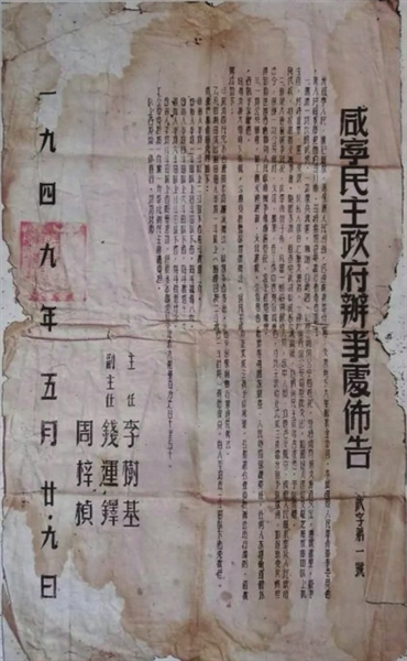 当年5月29日,咸宁城乡大街小巷显要位置,都张贴了一张“咸宁民主政府办事处布告”。这张布告为秘字第一号,内容涵盖解放初期共产党执政后对恢复社会生产、经济秩序,肃清残敌、支援大军等各方面。最后写道“以上各项仰一体遵行,切切此布。”落款为主任李树达,副主任钱远铎、周梓桢。当时看到这张布告,人们欢欣鼓舞,奔走相告。