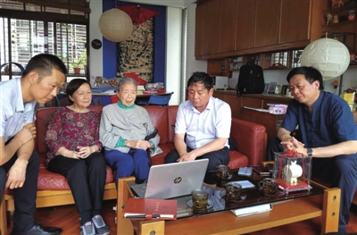 精神矍铄、思维敏捷、和蔼可亲、有问必答……这是王秋华女士给6人采访团共同的印象。采访团首先转达了市委书记丁小强和崇阳县委书记杭莺对王世杰先生家人的问候,王秋华女士深表感谢。当崇阳县领导张正韶将设计精致的王世杰纪念册递给王秋华时,她对家乡人为王世杰故居所付出的一切感念不已;白霓镇镇长谭其军还递上别有风味的土特产,请老人品尝“家乡的味道”;武汉大学教授薛毅和胡潇也代表武大人对老校长表示崇高的敬意,并介绍了武大的巨大变化和樱花之美。