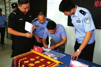 本报讯(记者 葛利利 通讯员 雷刚 摄影吴涛) 7月4日上午9时许,市公安局咸安分局马桥派出所在所内举行退赃大会。当日会场上,7名受害者为该所送锦旗表示感谢。
