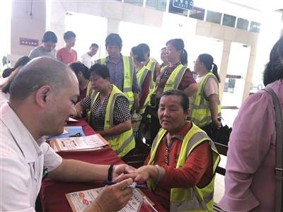 在前来敷贴的市民中,有一群身着环卫制服的环卫工格外显眼,他们是来自银泉大道和桂花北路辖区的环卫工人。