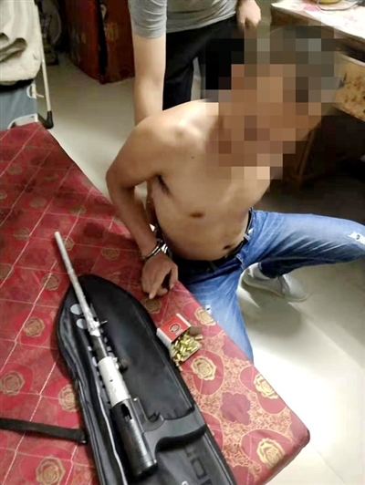 7月18日晚,通山县公安局组织禁毒、巡逻、派出所等警种部门多警联动,在堵住可能的出口后,民警一脚踢开房门,率先以迅雷不及掩耳之势冲上前去,将正准备从床上起身的嫌犯谭东按在床上,并死死控制住谭东意欲伸向枕头的手。一旁的民警迅速掀开枕头,赫然发现一支上了膛的枪。