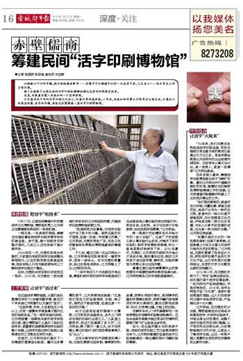 江月明说,在刘美松的计划里,博物馆建成后还将逐步恢复泥活字、木活字印刷技术,并结合商业开发模式,将整个活字印刷的历史进行整理,以不同的形式反映出来,尔后博物馆就可对外开放,让更多人了解活字印刷,让这一体现中国人智慧的古老发明在赤壁焕发出新的光彩。